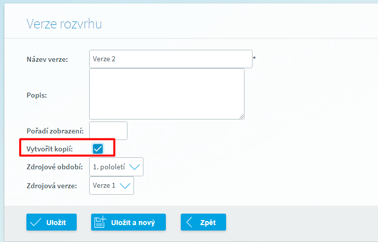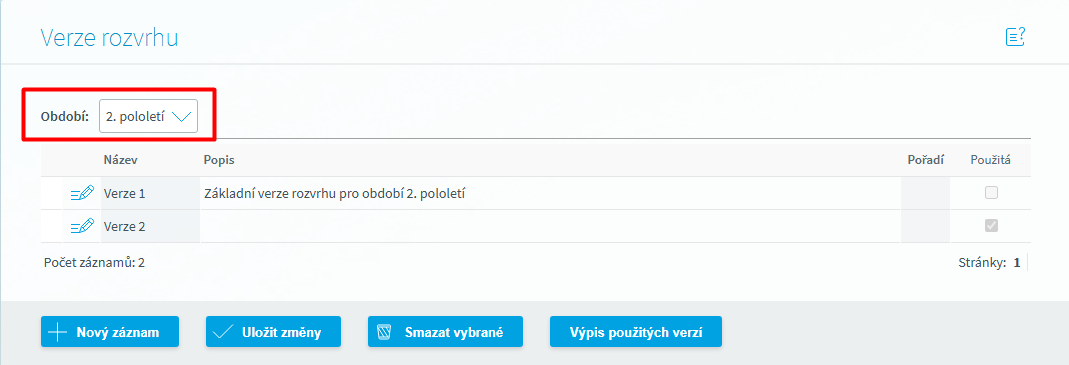 Nezapomeňte při vstupu na formulář Verze rozvrhu zvolit období 2. pololetí a kliknout na tlačítko Nový záznam.