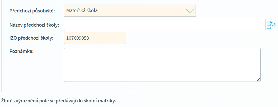 Na kartách žáků základních škol nově přibyla povinnost evidovat IZO školy, z níž do současného působiště nastoupili. Na záložce „Předchozí vzdělávání“ jsme proto žlutě podbarvili položku „IZO předchozí školy“. Bude zároveň zahrnuta do exportu dat pro MŠMT.