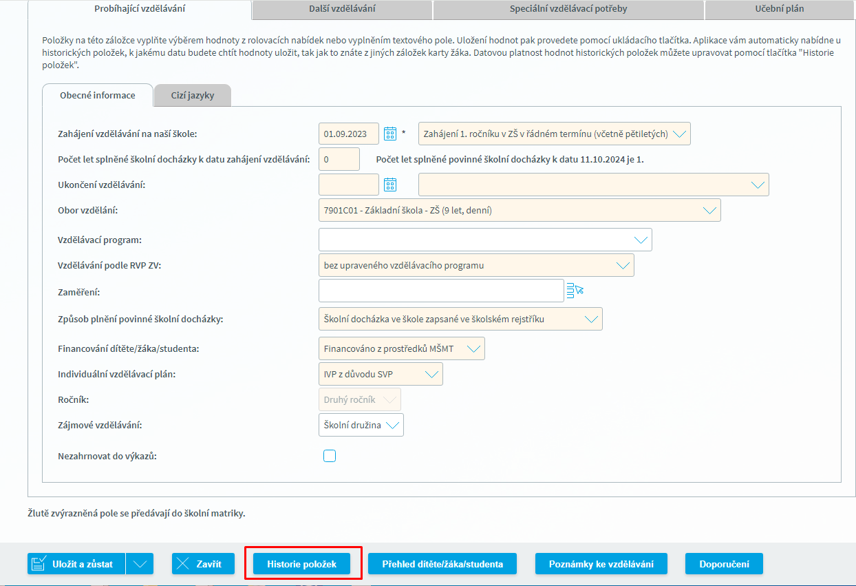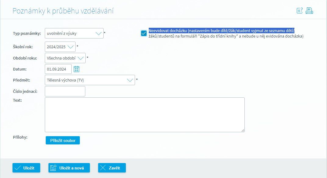 Využijte funkci na formuláři Poznámky ke vzdělávání, která vám s tímto nastavením pomůže. Informace zaevidované na tomto formuláři jsou zároveň zobrazovány na uzávěrce učitele v rámci daného předmětu.