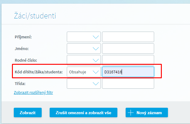 Máte ve škole žáky se speciálními vzdělávacími potřebami? Pro bezpečné zpracování citlivých údajů těchto žáků se používá tzv. kód žáka namísto rodného čísla. Pomocí tohoto kódu můžete snadno žáka ve školní matrice na formuláři Žáci/studenti vyhledat a identifikovat jej.