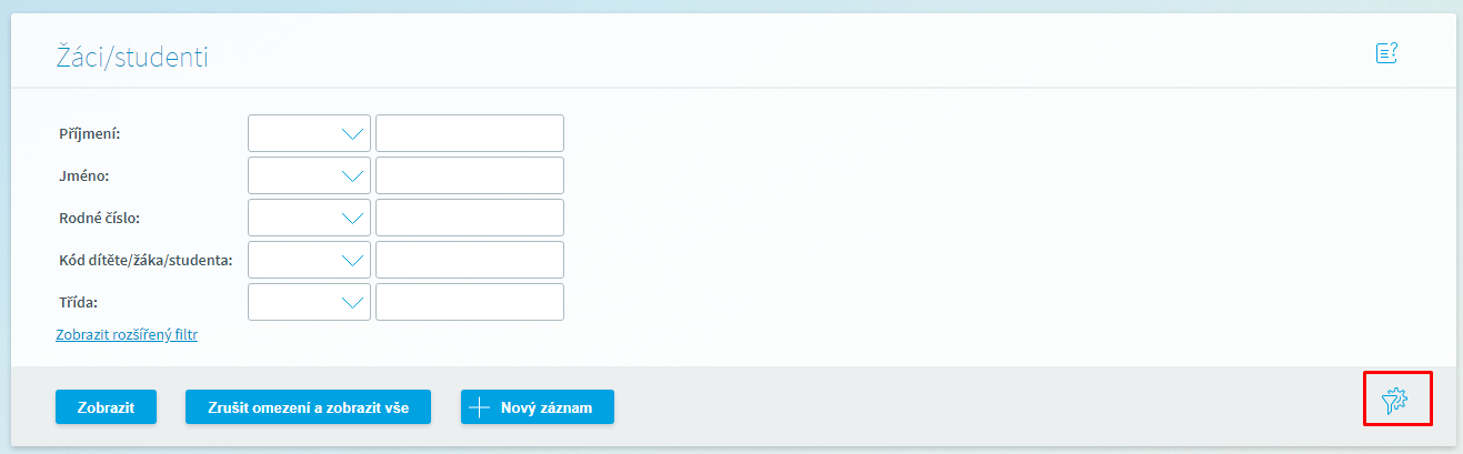 Pomocí funkce Spravovat filtr na formuláři Žáci/Studenti máte možnost přizpůsobit si vyhledávání podle vašich potřeb. Vyberte konkrétní údaje, které vás zajímají, a nadefinujte si pravidla, podle kterých budou výsledky filtrovány.