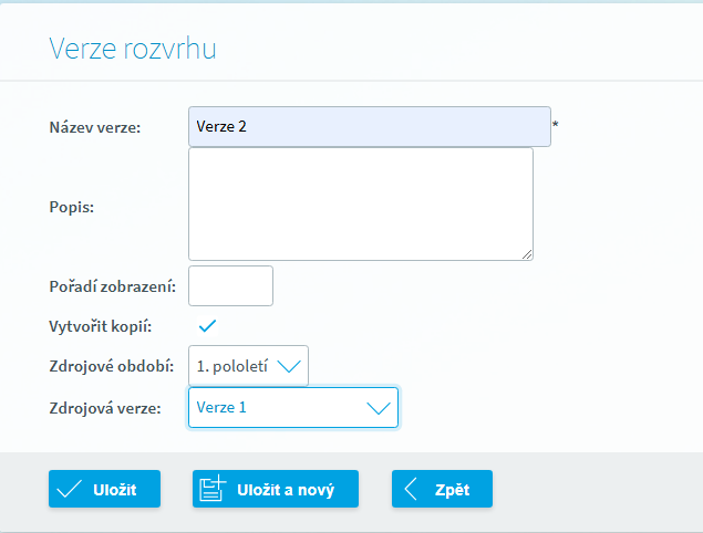 - V dalším kroku označte příznak Vytvořit kopii a vyberte verzi rozvrhu, ze které chcete vycházet. Tímto postupem vytvoříte kopii vybrané verze rozvrhu.