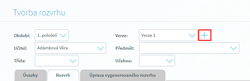 - Na formuláři Tvorba rozvrhu (v menu Rozvrhu a suplování – Rozvrh) klikněte na tlačítko se symbolem „+“ umístěné vedle pole Verze.