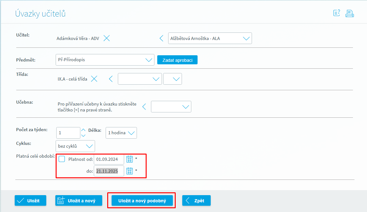 - Pomocí tlačítka Uložit a nový podobný vytvořím úvazek na nového učitele a obdobným způsobem omezím platnost v poli Platnost od tak, aby nový úvazek navazoval na ten původní.
